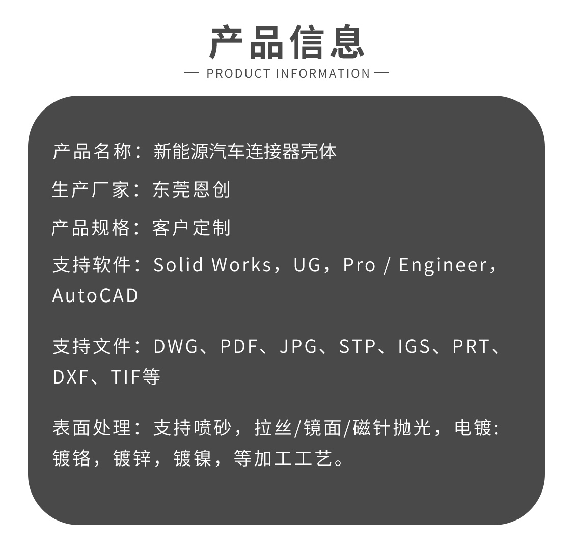 東莞恩創精密,鋅合金壓鑄廠家,20臺300噸鋅合金壓鑄機臺,服務于全球多家知名廠商,連接器外殼,新能源連接器外殼壓鑄件,公差可達正負0.002.鹽霧測試最高可達720小時,貫穿孔精度全部使用CCD全檢.