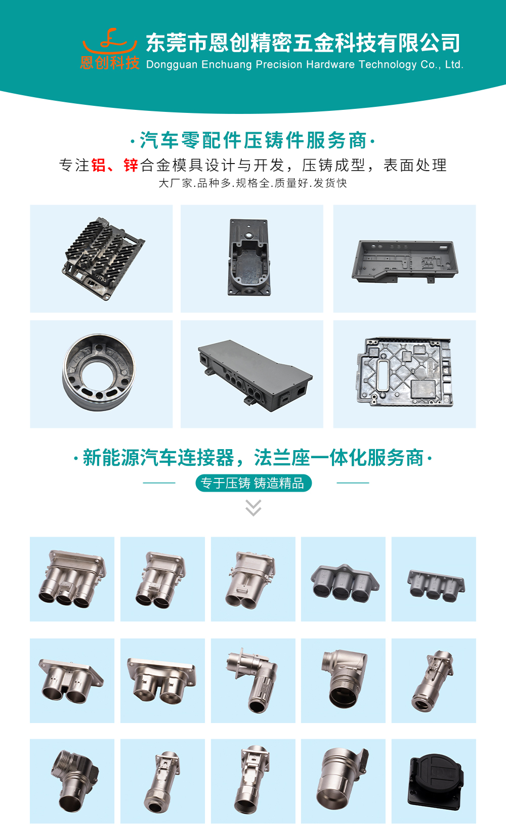 東莞恩創精密,鋅合金壓鑄廠家,20臺300噸鋅合金壓鑄機臺,服務于全球多家知名廠商,連接器外殼,新能源連接器外殼壓鑄件,公差可達正負0.002.鹽霧測試最高可達720小時,貫穿孔精度全部使用CCD全檢.