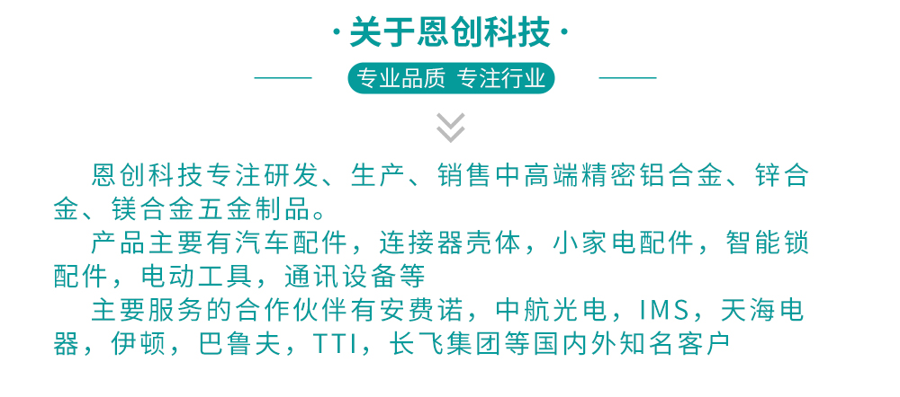 東莞恩創精密五金,15年經驗的鋁合金壓鑄件加工廠,所有壓鑄鋁材料為全新材料,無渣包料,無水口料,鋁合金壓鑄件工廠應用范圍有:連接器殼體,汽車配件壓鑄件,汽車連接器殼體壓鑄件。